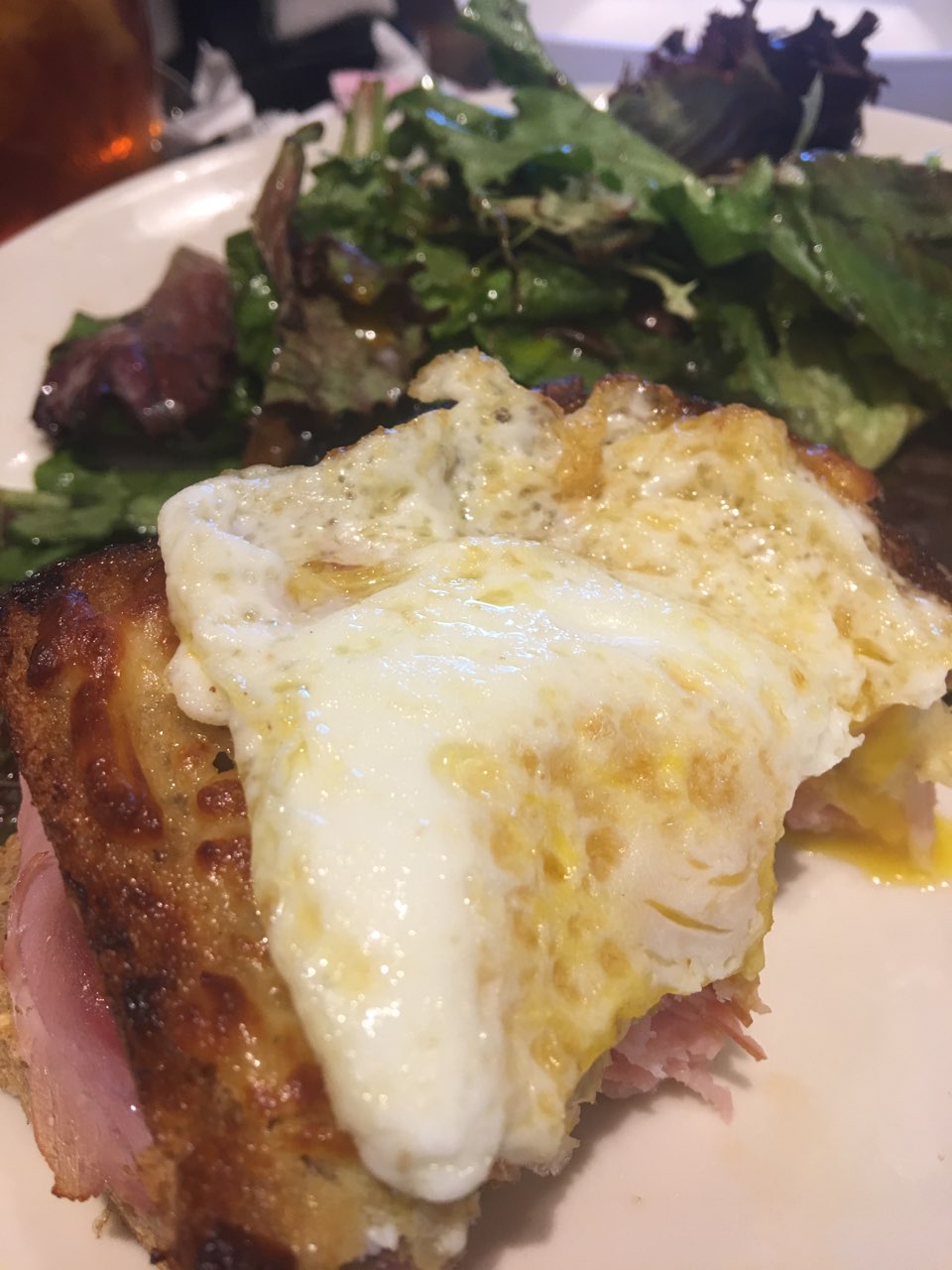 When butter is melted but not browned, crack an egg directly into the pan. The Croque Monsieur is a simple toasted ham and cheese sandwich with béchamel, while the Croque Madame is topped with a fried or poached egg. The main difference is in the addition of an egg to the Croque Madame